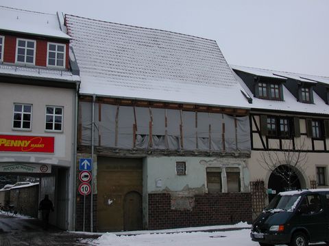 Das Traufenhaus wurde um 1550 in typischer Bauweise errichtet. Das feste Erdgeschoss war zum Schutz vor regelmäßigem Hochwasser höher gelegen. Das Obergeschoss ist als Fachwerk aufgesetzt. Spätgotische Tür- und Fensterlaibungen sind erhalten. Die Ackerbürgerhäuser waren nur teilweise unterkellert. Schwere Leiterwagen fuhren durch das große Tor zu den Hofanlagen.