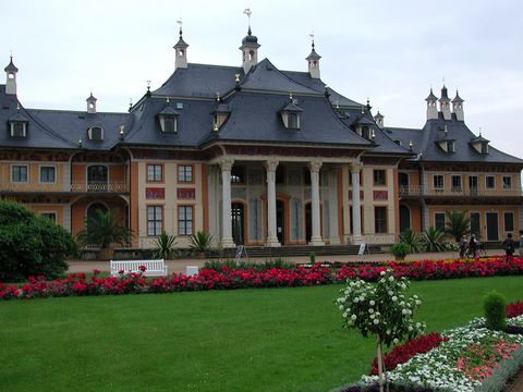 Das Bergpalais entstand spiegelbildlich zum Wasserpalais in fast identischer Form von 1723 - 1724. Beide Palais waren nicht als bewohnbare Schlossbauten konzipiert, sondern als Torhallen bzw. Spiel- und Festsäle.
