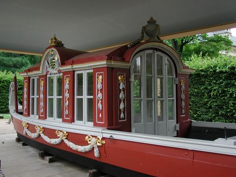Die rote Tritonengondel wurde zusammen mit einer "grünen" Schwester für den Kurfürst Friedrich August III. um 1800 gebaut. Sie diente zum höfischen Personenverkehr zwischen Dresden und Pillnitz.