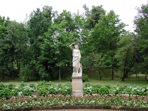 Nach Auflösung der Botanischen Schule 1867 im Holländischen Garten wurde auf der Blickachse zwischen Bergpalais und Chinesischen Pavillon eine Blumenterrasse angelegt. Seit 1870 steht dort die marmone Florastatue.